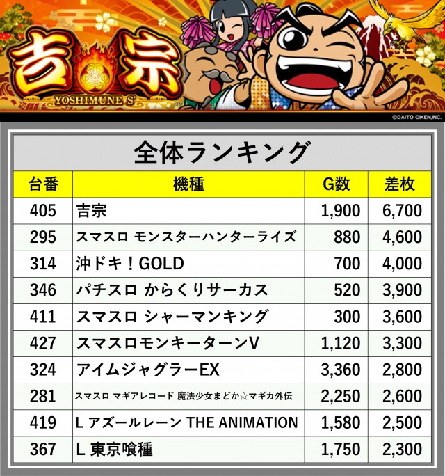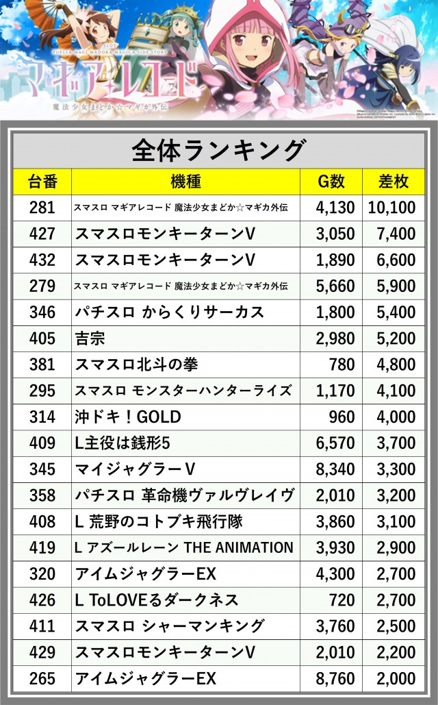 厳選された取材対象機種をはじめ、その他スロット全体から好記録が飛び出した!プレイヤーが楽しんだ1日を下記データにて振り返ってみて欲しい。