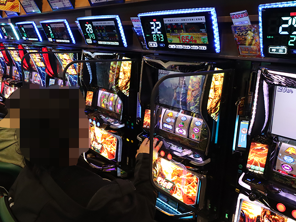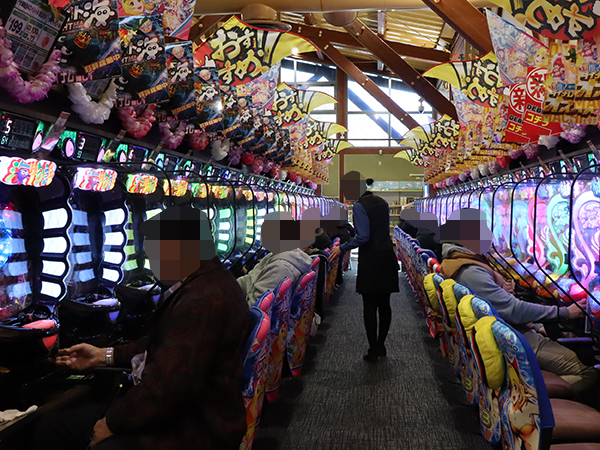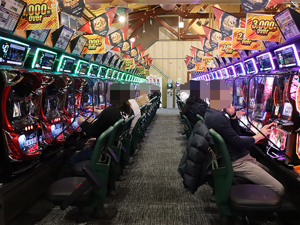 取材時は多くのプレイヤーが来店。パチンコ・パチスロともに、様々な機種が支持を得ていた。