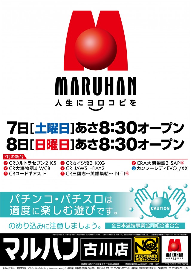 開店15分前に順番券の配布予定 ※新台入替初日のみ開店1時間前 |