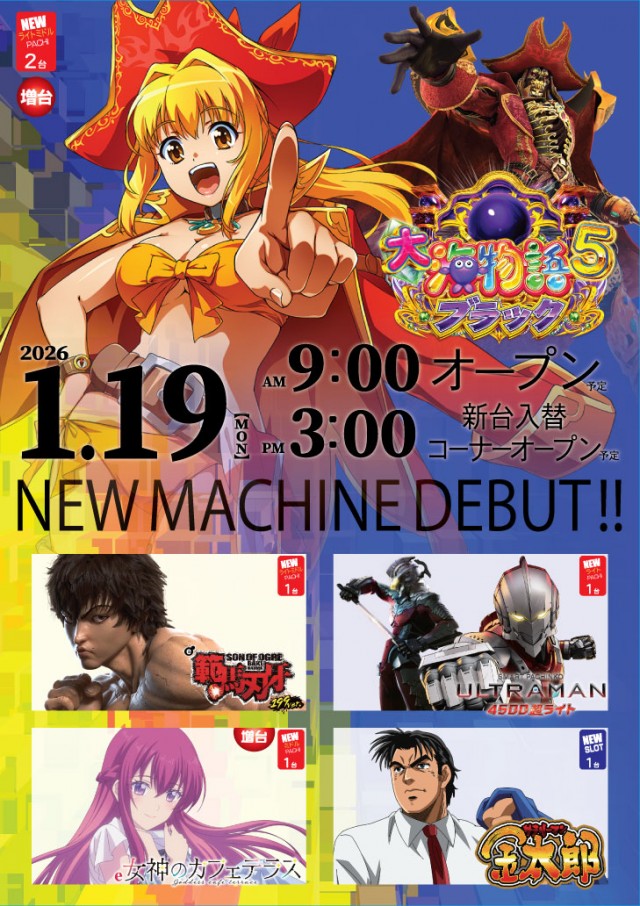 1月19日新台入替9時開店(予定)新台15時開放(予定)😉
