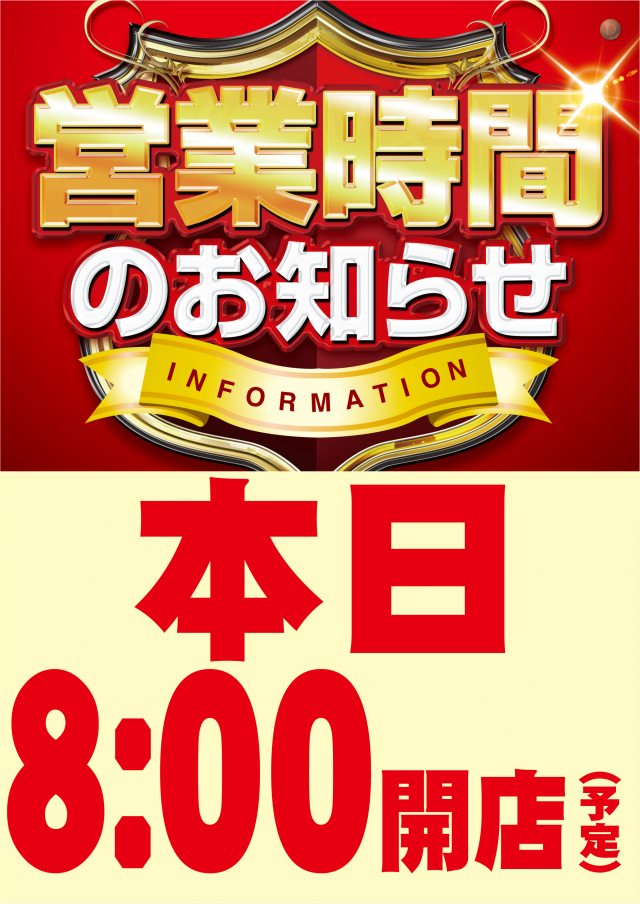 月~金 8:30~24:00(遊技終了23:45) 土・日・祝 8:00~24:00(遊技終了23:45) |
