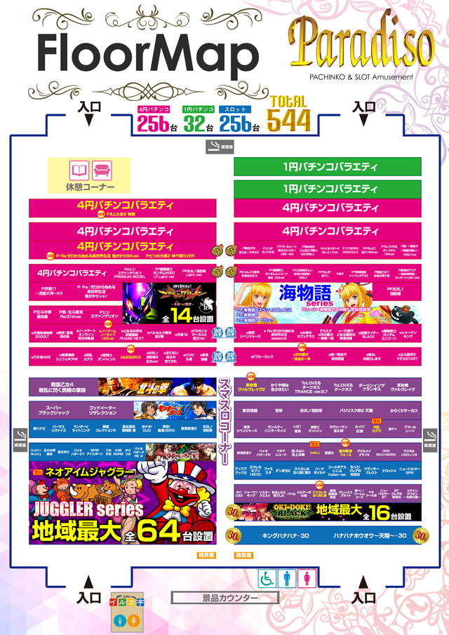 4パチ:256台 1パチ:32台 1000円/50枚スロ:256台 |