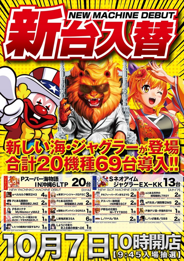10月7日(火)新台入替★新しい海&ジャグラー登場!