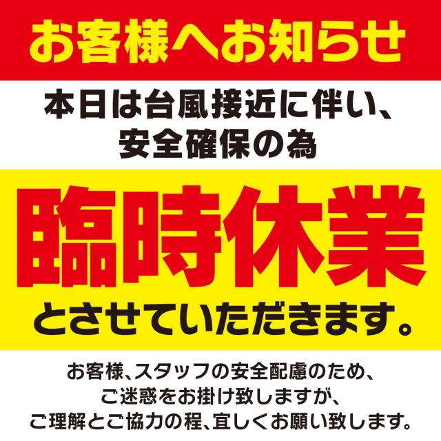 明後日19日(月)の営業については台風の状況を確認しお知らせいたします。