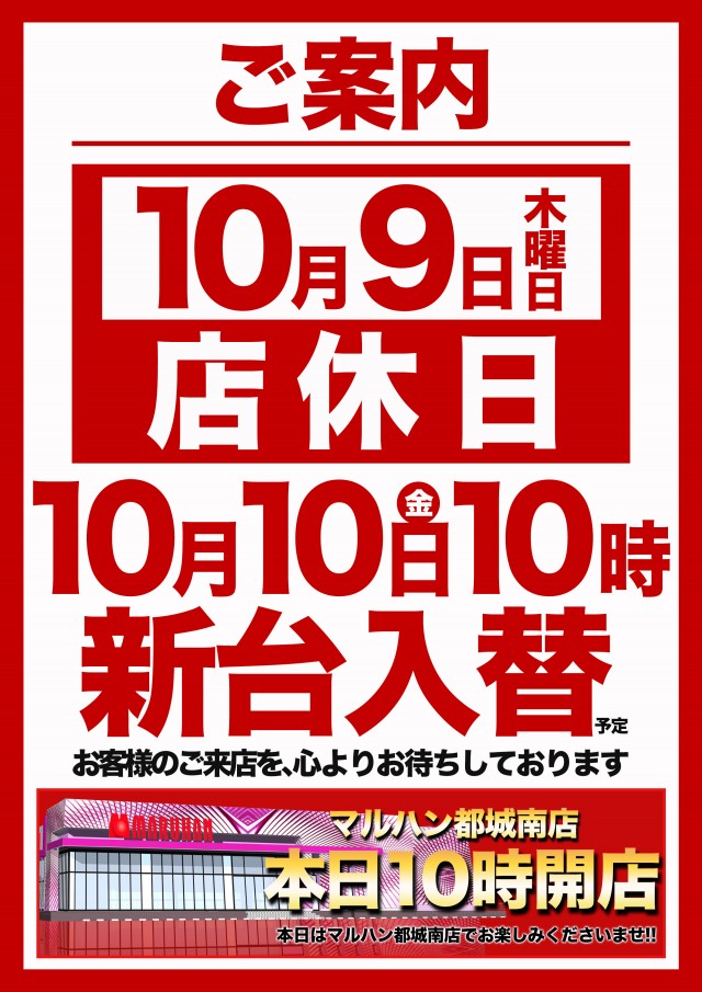 10月9日(木)新台入替準備の為【店休日】とさせて頂きます