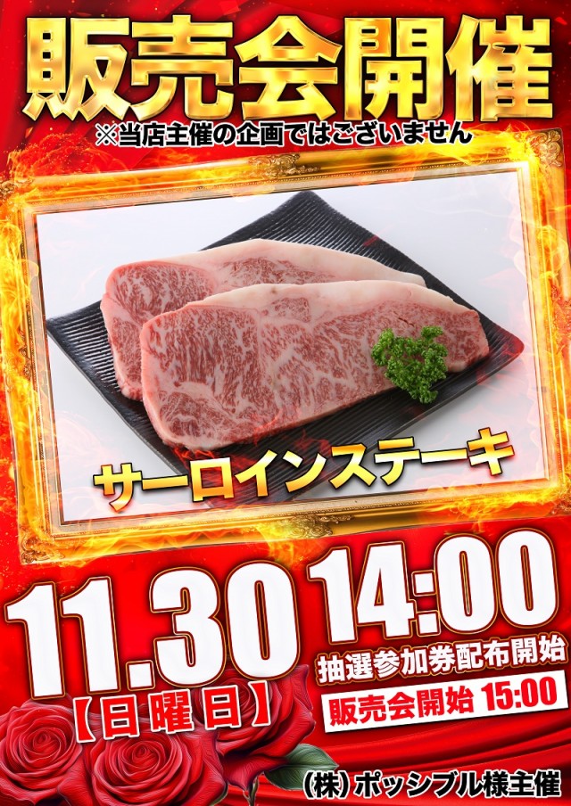 ◇◆◇◆◇◆◇◇◆◇◇◆◇◇◆◇11月30日(日)10時OPEN!入場抽選は9時40分開始▽▽▽(株)ポッシブル様主催による、サーロインステーキの【販売会】も開催♪◇◆◇◆◇◆◇◇◆◇◇◆◇◇◆◇