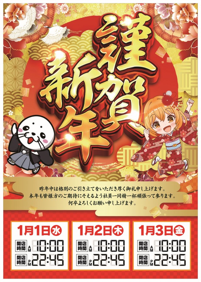 厚く御礼申し上げます。本年も皆様方のご期待にそえるよう社員一同精一杯頑張って参ります。本年も変わらぬご愛顧の程よろしくお願い申し上げます。本日1月1日元旦10時オープン本日より通常営業いたします。皆様のご来店スタッフ一同心よりお待ちしております。 -