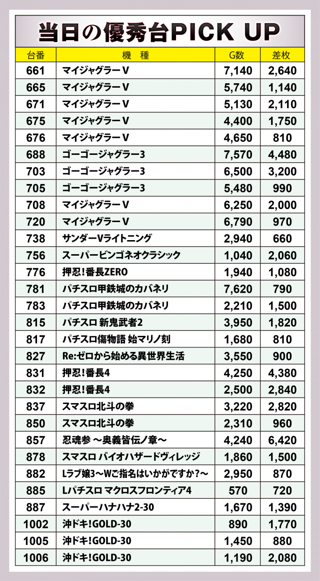 ここからは入手した出玉データから、この日の優秀台を紐解いていく。