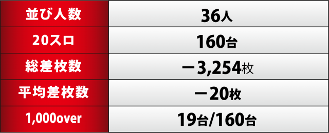冒頭で述べた通り、今回は[1000円/50枚] スロ160台の通算では僅かにプラスに届かず、連勝の実現を逃してしまった。