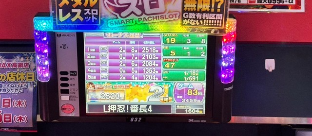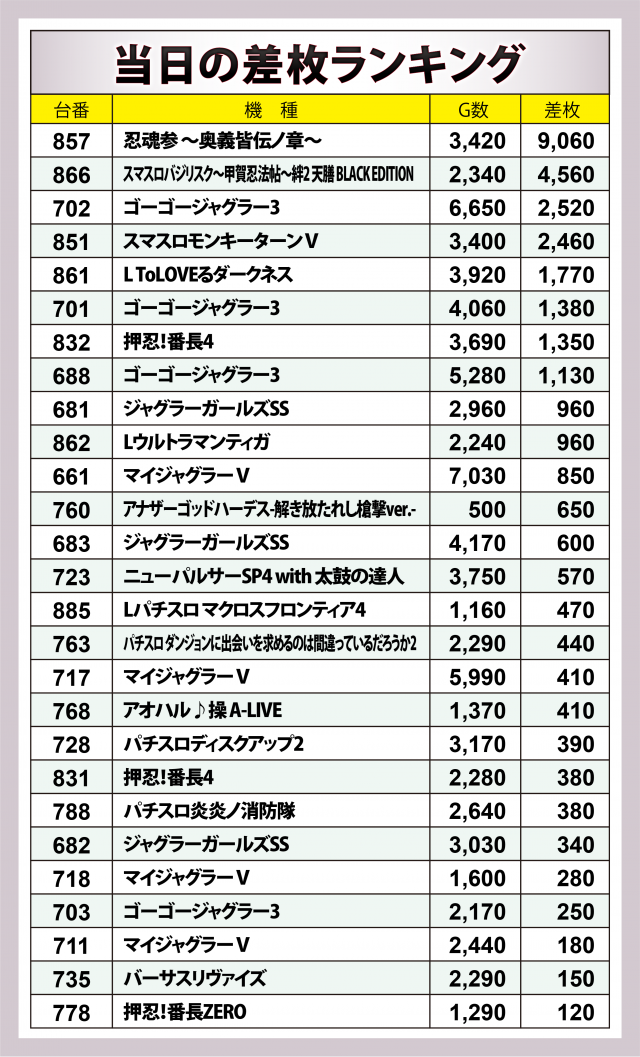 前回に続き『忍魂参 ~奥義皆伝ノ章~』が+9,100枚弱で全台のトップに輝いた他、『スマスロバジリスク~甲賀忍法帖~絆2 天膳 BLACK EDITION』が+4,600枚弱をマーク。また『マイジャグラーⅤ』『ゴーゴージャグラー3』にプラス台が目立った。