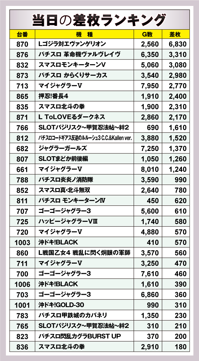当日の差枚数ランキングはこちら。トップは『Lゴジラ対エヴァンゲリオン』の877番台から6,830枚。さすがの出玉性能といったところか。