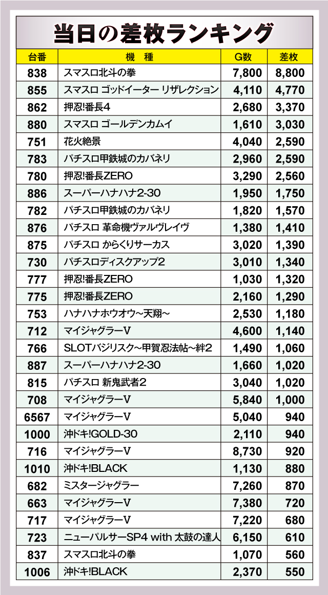 差枚トップこそ人気ナンバー1の『北斗の拳』が飾ったが、2位以下は個性的な機種も加わり、差枚ランキングの上位はバラエティに富んだラインナップとなった。それだけ、どの機種にもチャンスがあったということの証明とも言える。次回はどの機種がトップに立つのか。楽しみは尽きない。
