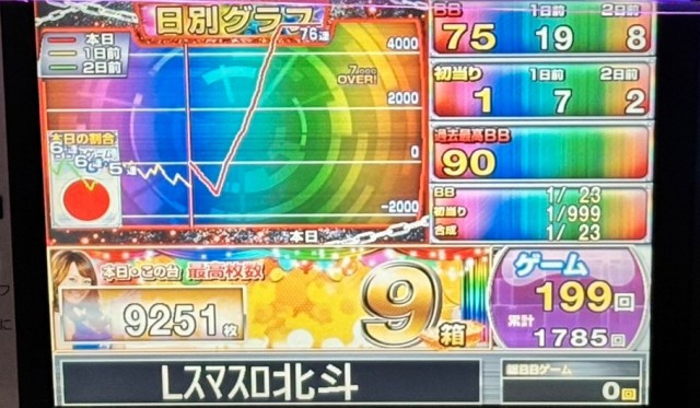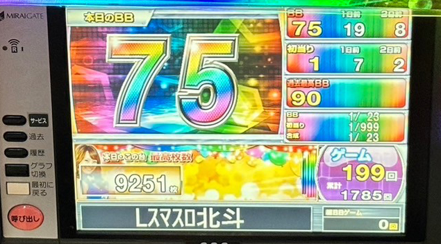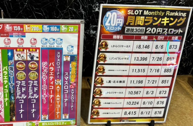 優秀台を見てみると、+8,800枚を記録した『スマスロ北斗の拳』838番台が素晴らしかった。スマスロを代表する機種として、まだまだ不動の人気を誇っている。それに続いたのが新鋭『スマスロ ゴッドイーター リザレクション』。855番台が+4,770枚をマークしている。定番中の定番、『押忍!番長4』4553も黙ってはいない。862番台が+3,370枚を叩き出し、健在ぶりをアピールした。以下、+3,030枚の『スマスロ ゴールデンカムイ』880番台、+2,590枚の『花火絶景』751番台、+2,590枚の『パチスロ甲鉄城のカバネリ』783番台、+2,560枚の『押忍!番長ZERO』780番台と続いた。