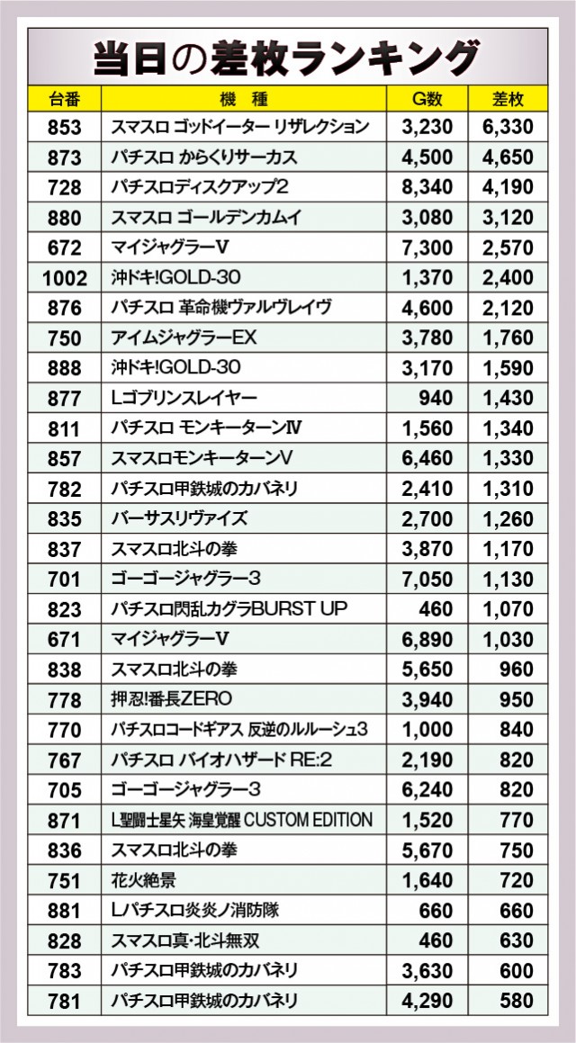 ※差枚数順に掲載しています。