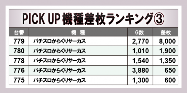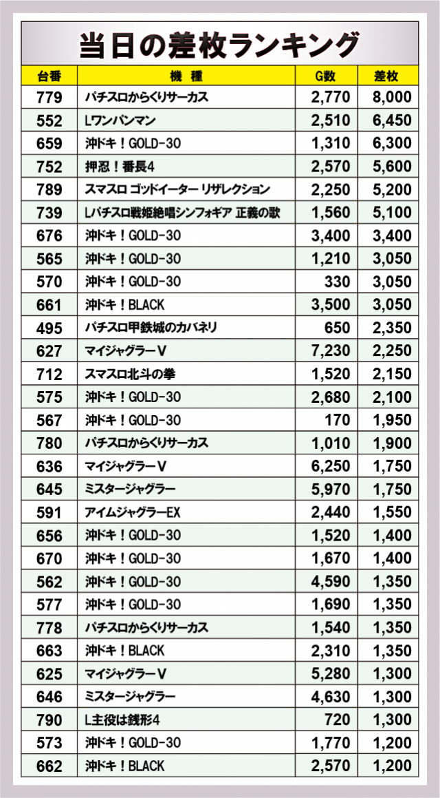 この日のトップ差枚数をマークしたのは779番台『パチスロ からくりサーカス』で+8,000枚。次いで、最新台『Lワンパンマン』で+6,450枚、『沖ドキ!GOLD-30』で+6,300枚をマークし、定番人気機種から最新台、メダル機まで幅広い機種にチャンスがあったことが窺える。