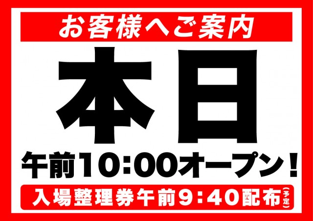 入場抽選はオンライン抽選です。9時30分迄に店舗敷地内にお集まり頂いたお客様を対象とします。 |