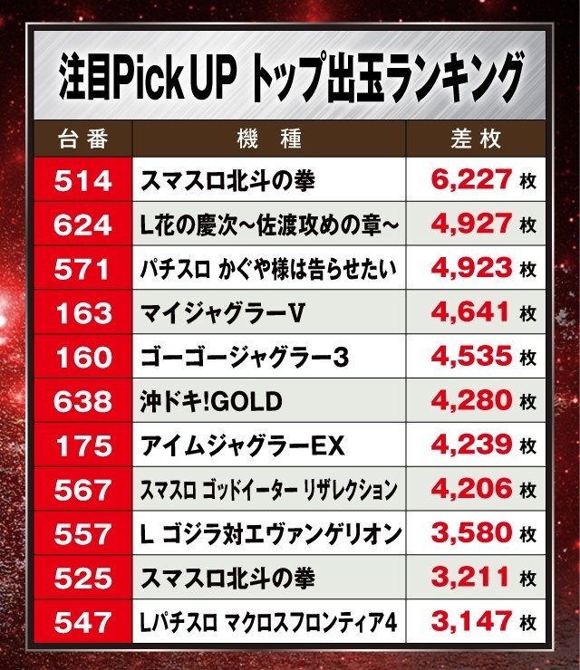 また、ジャグラーシリーズも大奮闘しており『マイジャグラーⅤ』、『ゴーゴージャグラー3』、『アイムジャグラーEX』で、それぞれ+4,000枚超が出現する盛況ぶりを見せファンを喜ばせていた。