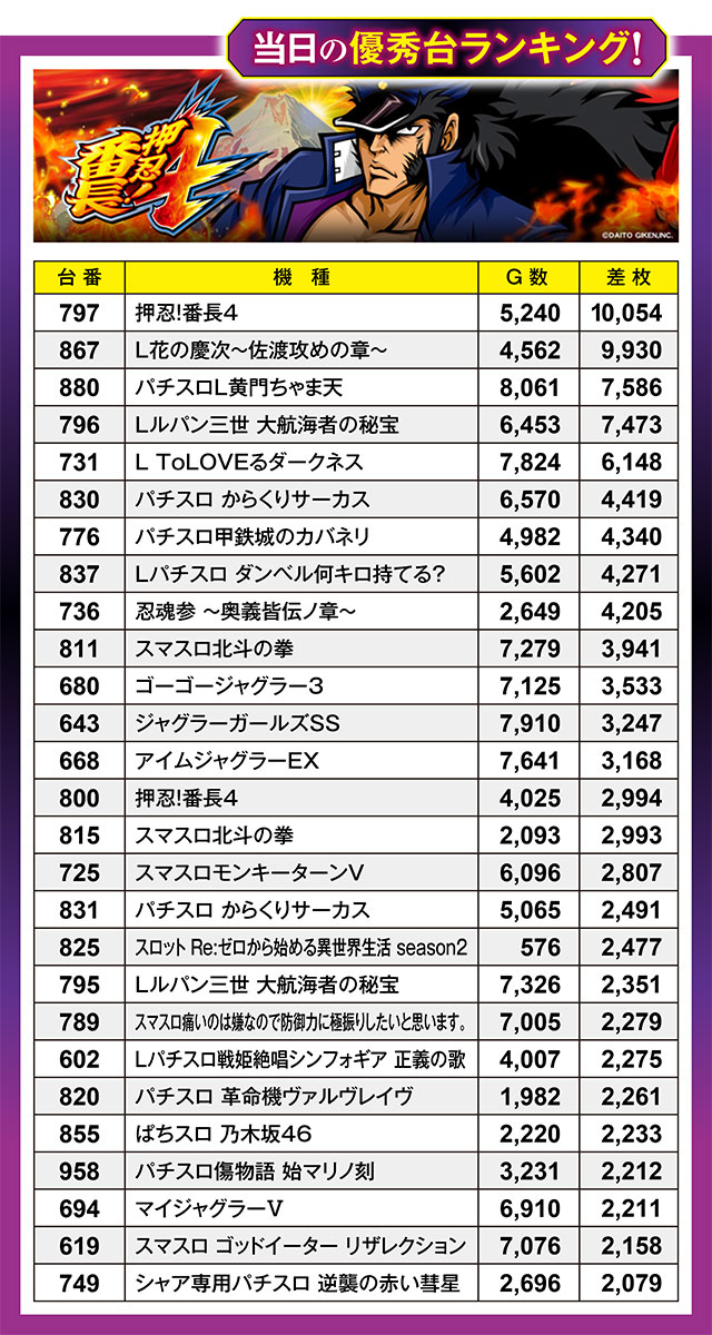 前回11月30日に優秀台ランキング入りを逃した『押忍!番長4』が、10,000枚オーバー記録で首位リベンジをやってのけた。この日はランクイン常連機種たちを退け、2位に『L花の慶次~佐渡攻めの章~』、3位に『パチスロL黄門ちゃま天』がランクインを果たすなど、メイン機種以外の機種が大健闘!