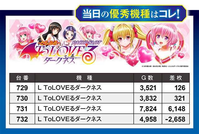 3/4台がプラスだった『L ToLOVEるダークネス』。731番台の挙動が非常に優秀だったためなのか、残る3台はいずれも5,000G未満しか回されず。その結果、ちょいプラスとマイナスという差枚に…。