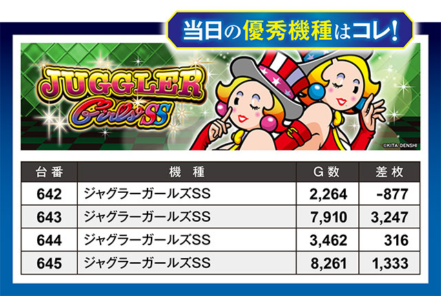 4台中3台がプラス差枚となった『ジャグラーガールズSS』だが、しっかり回されたのは1,000枚以上のプラスを記録した2台のみ。残りの2台も最低でも5,000G回されていたら、全台プラスを狙えたかもしれない。