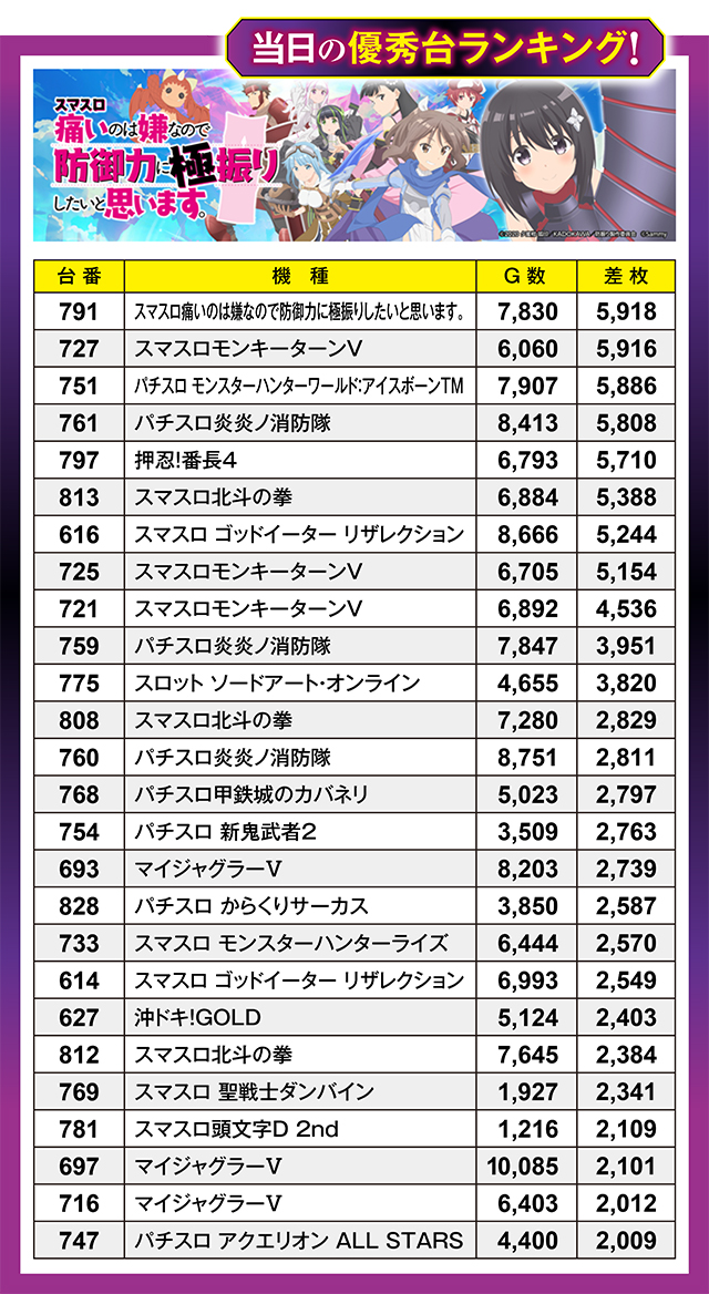 まさかの『スマスロ痛いのは嫌なので防御力に極振りしたいと思います。』が1位記録となった今回。しかしその記録は6,000枚弱であり、10,000枚超えが4台も誕生した前回からパワーダウンを感じさせることとなった。