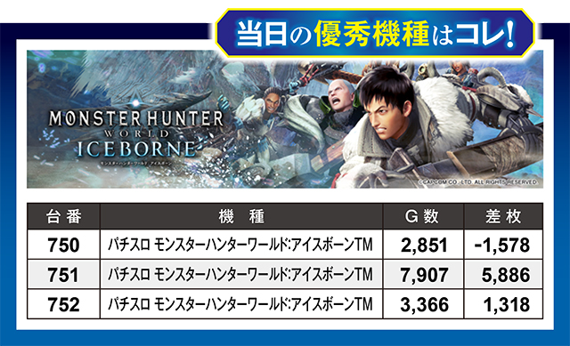 751番台が好挙動を示し、あれよあれよと5,000枚を突破!前回は全台プラスをマークした『パチスロ モンスターハンターワールド:アイスボーンTM』だけに、今回もシマ環境は優遇されていた…!?