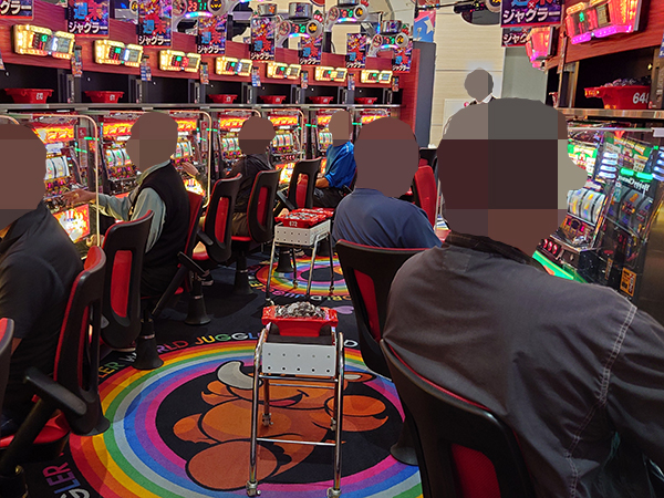 1000円/46枚パチスロに目を向けると「アイムジャグラーEX」や「マイジャグラーⅤ」が微笑ましい状況。機種性能を最大限に発揮するプレイヤーが複数見られた。