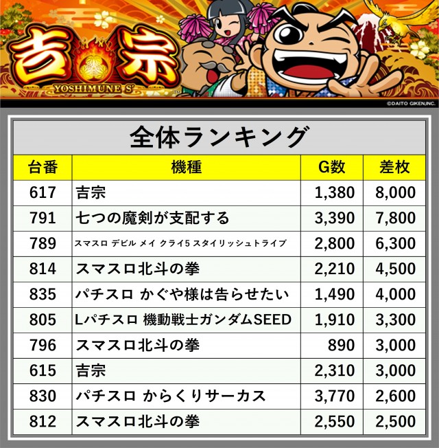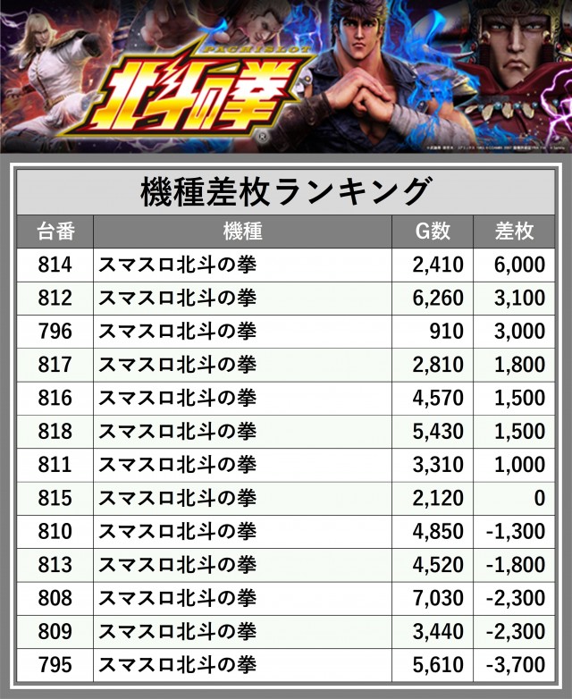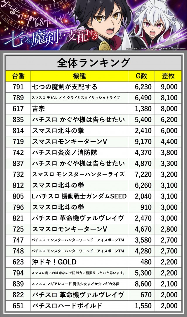 ※差枚数順に掲載しています