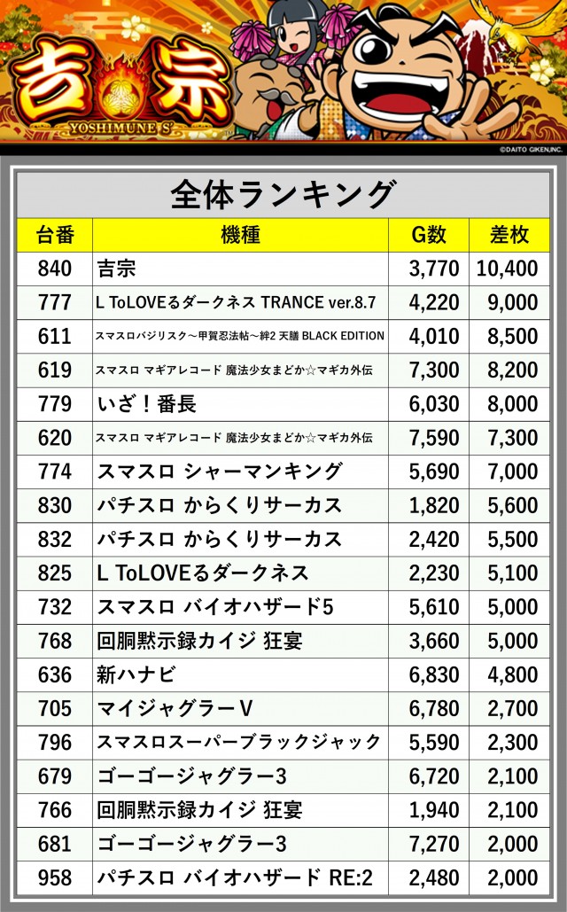 ※差枚数順に掲載しています