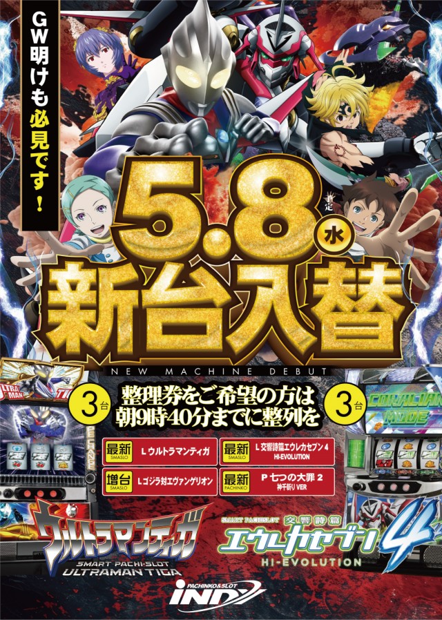 明日5/8(水)新台入替、朝10時OPEN☆