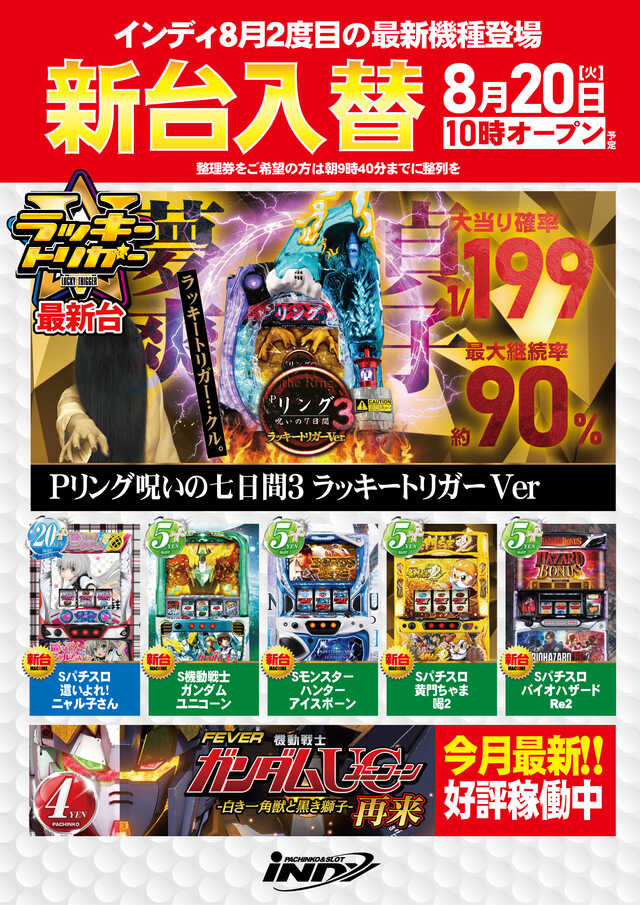 明日8/20(火)新台入替&4パチ増台 朝10時OPEN‼