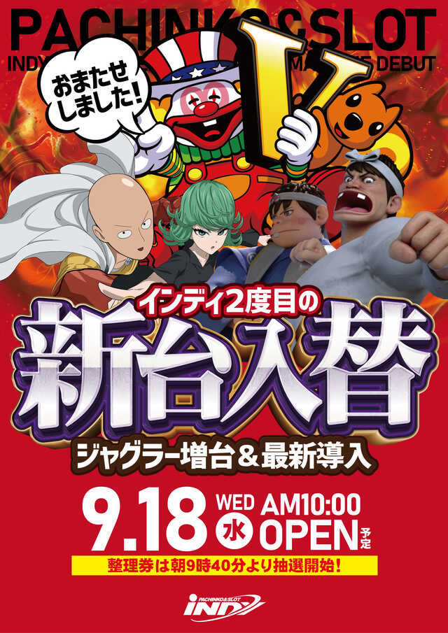 ☆明日9/18(水)新台入替、朝10時OPEN☆