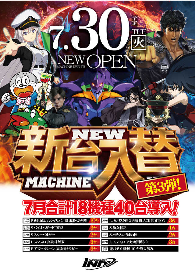 明日7/30(火)新台入替、朝10時OPEN☆