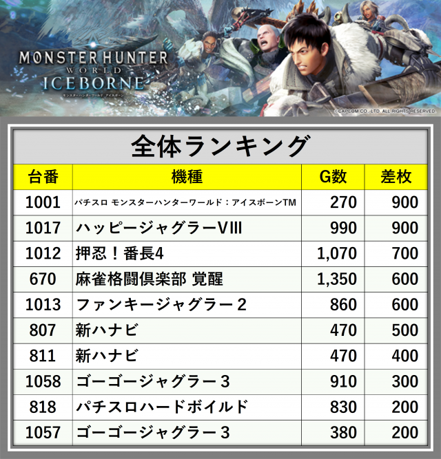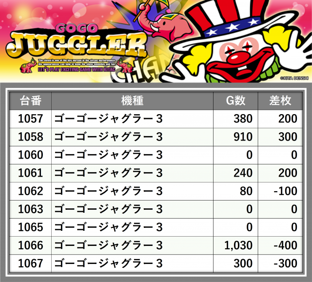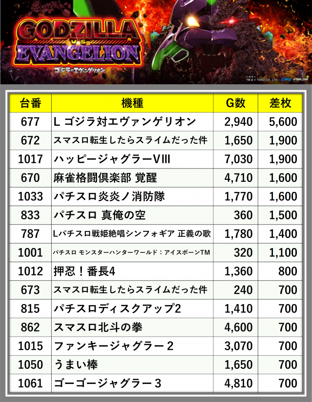厳選された取材対象機種をはじめ、その他スロット全体から好記録が飛び出した!プレイヤーが楽しんだ1日を下記データにて振り返ってみて欲しい。