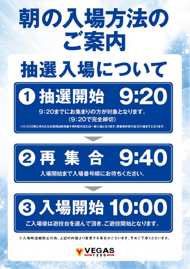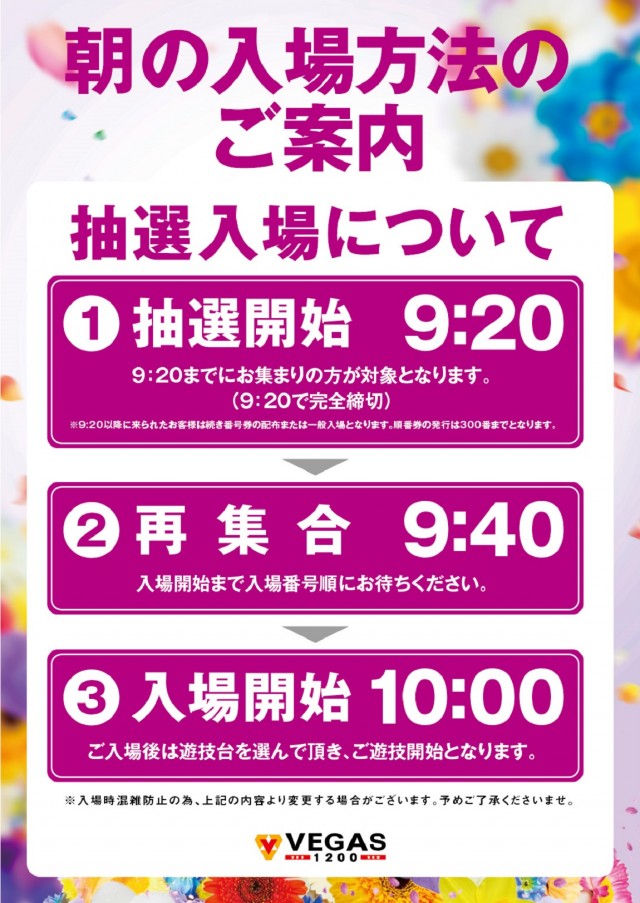 並んだ順で9:45より抽選を開始致します(詳細は最新情報へ) |