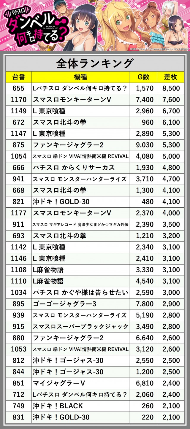 厳選された取材対象機種をはじめ、その他スロット全体から好記録が飛び出した!プレイヤーが楽しんだ1日を下記データにて振り返ってみて欲しい。