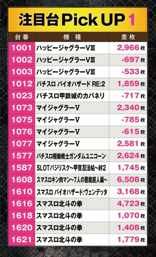 スマスロにおいては『スマスロキン肉マン~7人の悪魔超人編~』『スマスロ バイオハザード:ヴェンデッタ』『スマスロ北斗の拳』の3機種どれも3,000枚オーバーの好調台を確認。スマスロの性能をいかんなく発揮している。