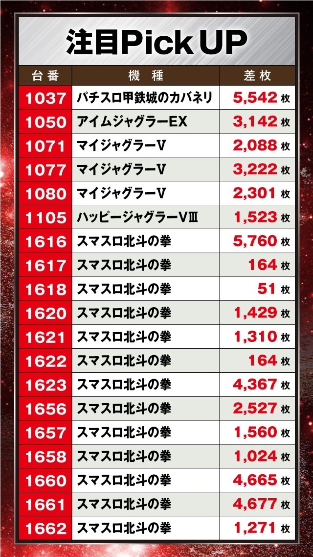 この日の注目機種は、全台系の対象となった『スマスロ北斗の拳』で13台全てがプラスで終了している。しかも、+5,000枚超が1台に+4,000枚超が3台も出現しており、全台平均が+2,228枚という優秀な結果を残しているだけに、誰もが熱きバトルを繰り広げたのが想像できるだろう。