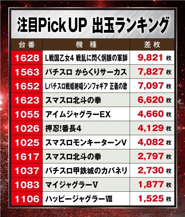 この日の店内状況を見てみると、出玉ランキング1位に輝いた『L戦国乙女4 戦乱に閃く炯眼の軍師』が万枚目前の+9,821枚を記録、また、導入間もない『Lパチスロ戦姫絶唱シンフォギア 正義の歌』からも+7,097枚が出現する見事な結果を残している。