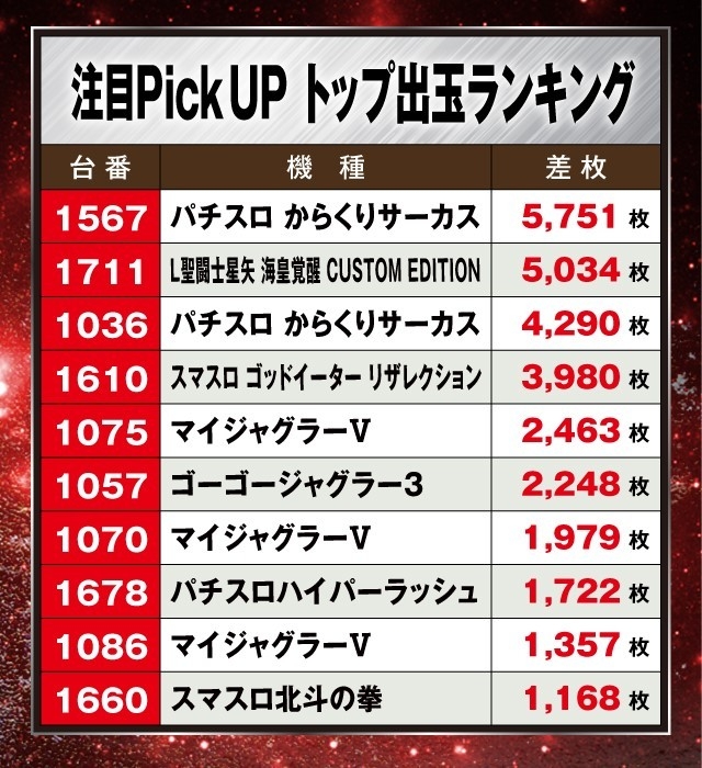 この日は人気のスマスロ『パチスロ からくりサーカス』が絶好調で、1567番台が+5,751枚、1036番台が+4,290枚を叩き出し、出玉ランキングベスト3に2台がランクインする見事な結果を残している。