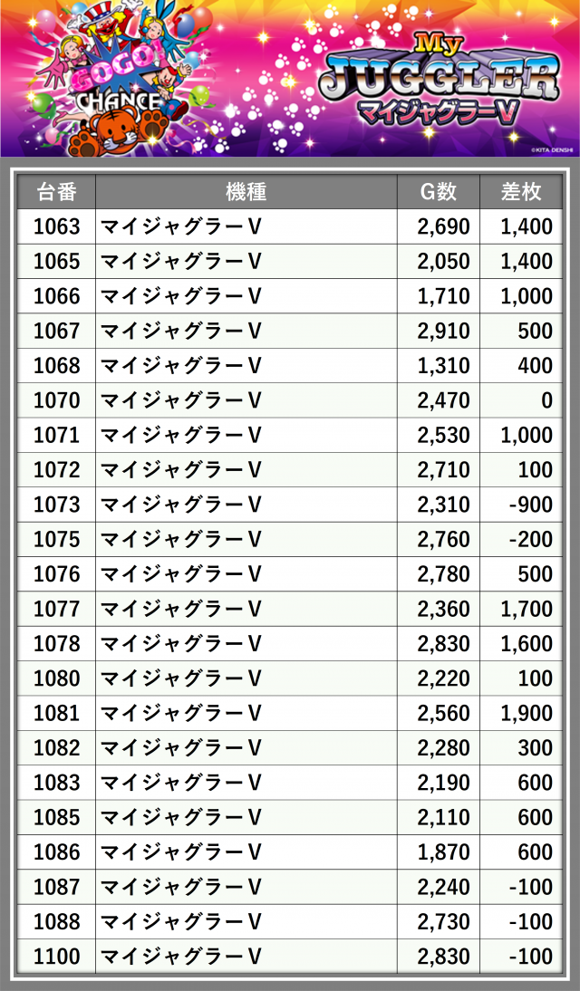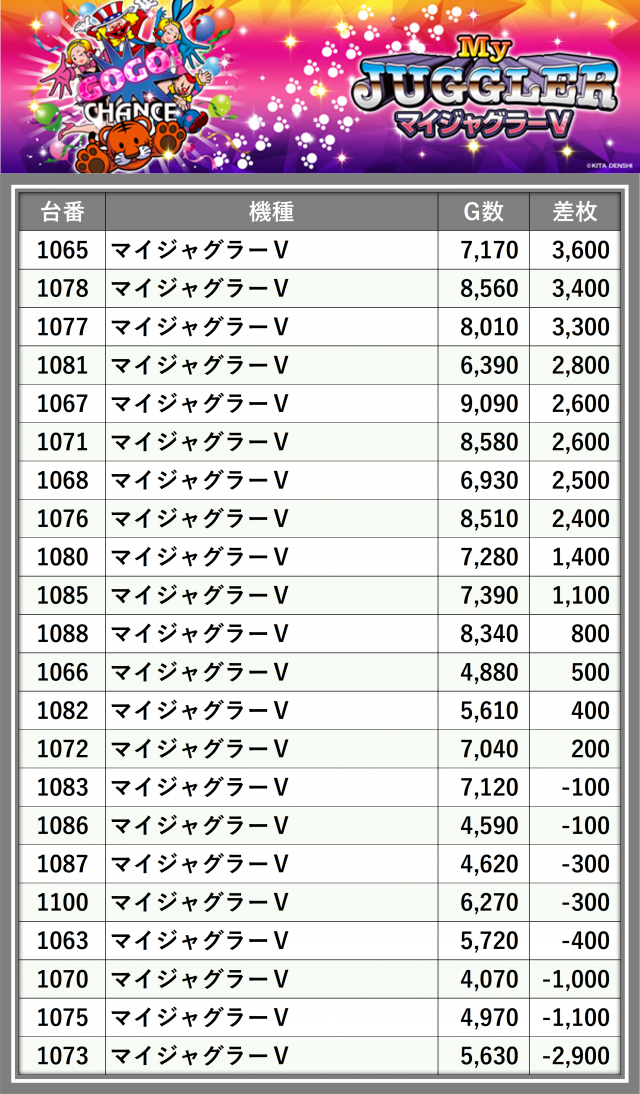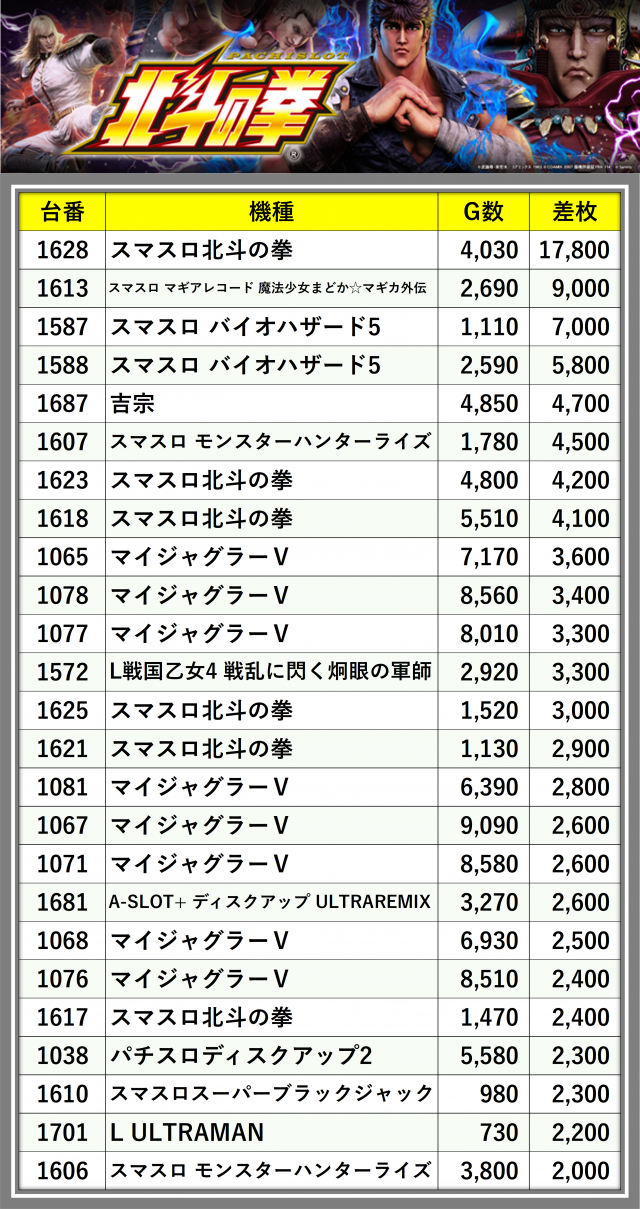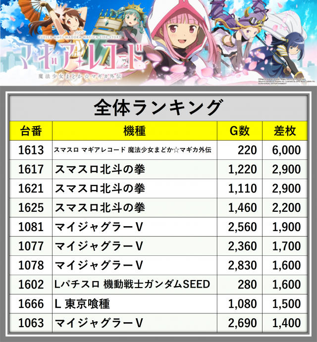 ※差枚数順に掲載しています