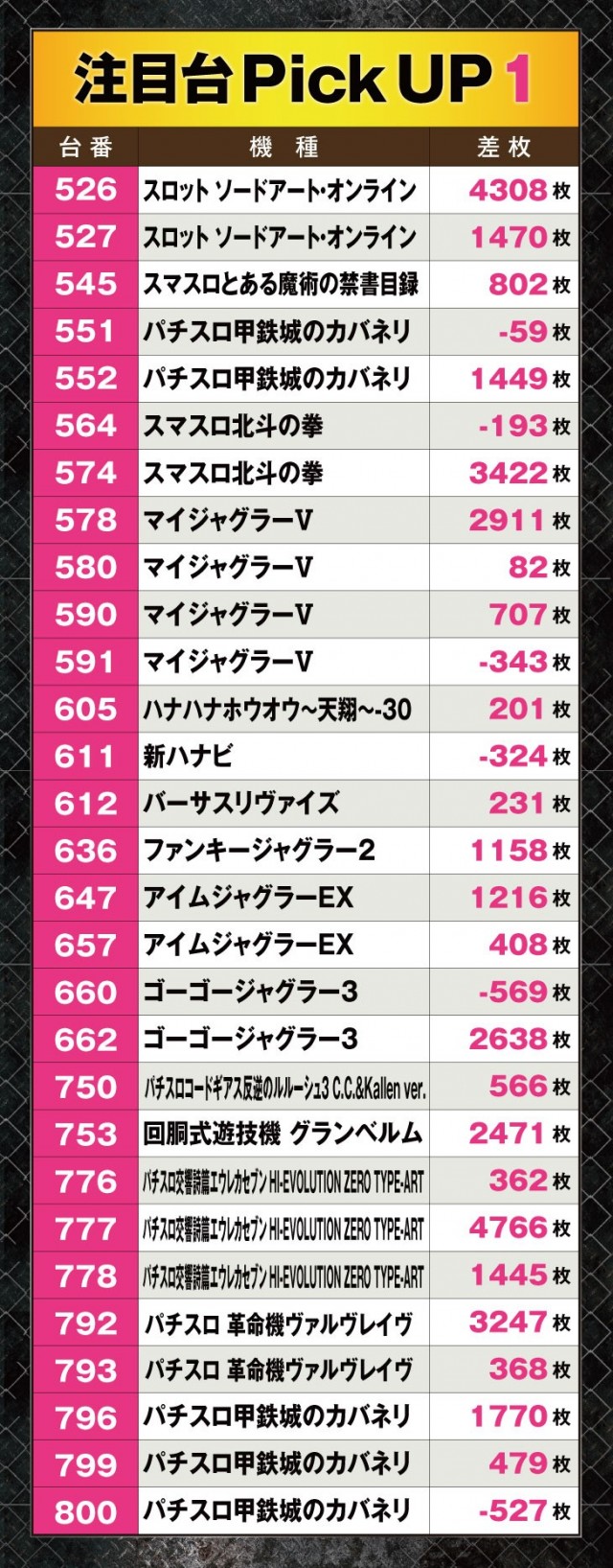 店内状況はというと、全台系や並びを中心に好調台が目につく結果となった。