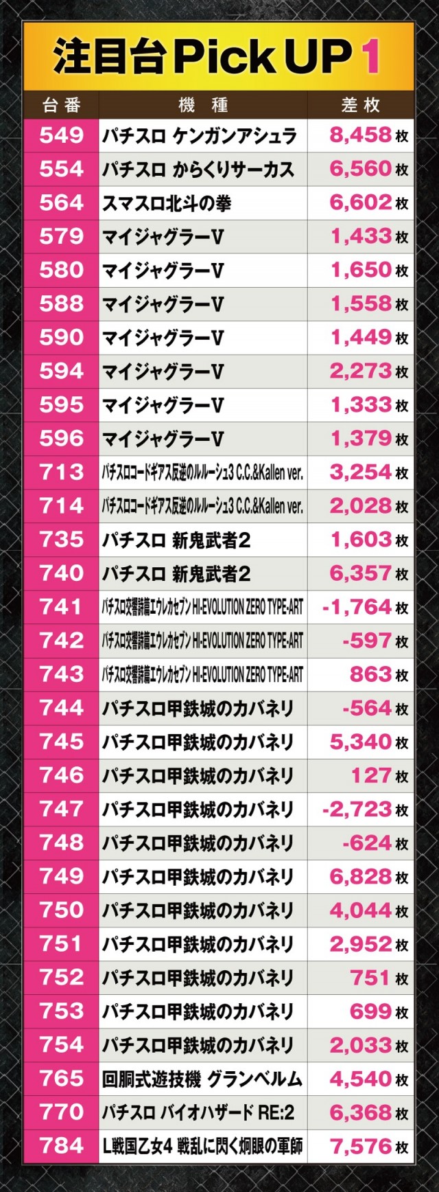 店内状況を見てみると5,000枚を超える好調台が多く、随所で活気が感じられた!なかでも『パチスロ ケンガンアシュラ』が+8,458枚と、機種性能を上手く発揮していたことが印象に残っている。