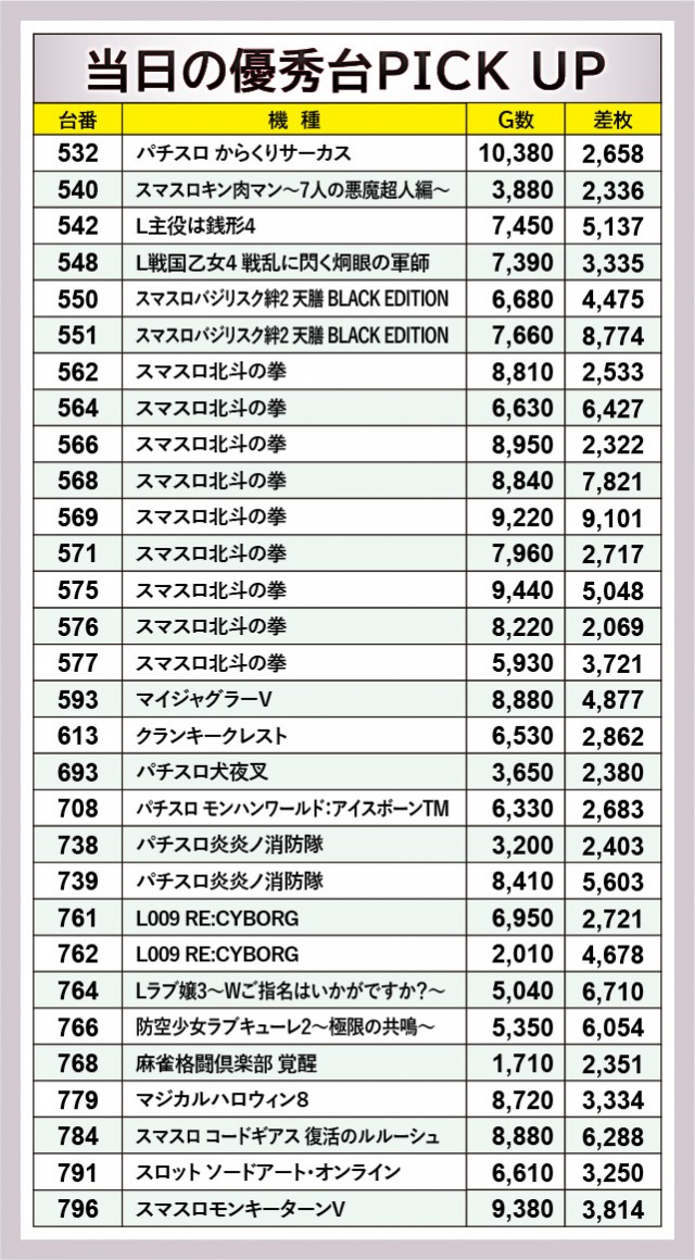 当日は多くの台が熱気を放ち、遊技していたファンを大いに刺激したことだろう。『パチスロ からくりサーカス』『スマスロ コードギアス反逆のルルーシュ/復活のルルーシュ』『L009 RE:CYBORG』『Lラブ嬢3〜Wご指名はいかがですか?〜』はかなりのポテンシャルを秘めており、その可能性に気づいたファンはレバーONに力が入ったはずだ。また『パチスロ炎炎ノ消防隊』でもそのポテンシャルが発揮され、こちらもしっかりと結果を残しているのが目に焼きつくばかりだ。