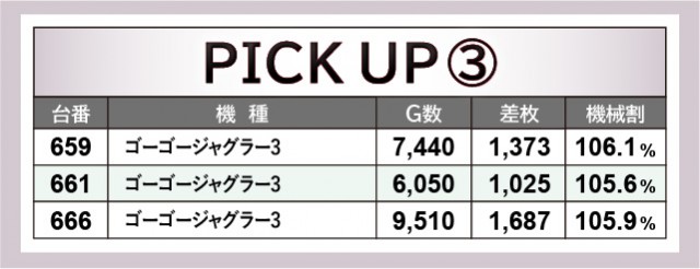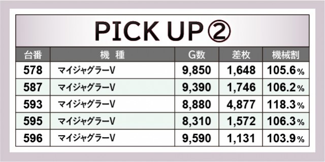 『スマスロ北斗の拳』もその実力を見せ、その中で568番台+7,821枚や569番台+9,101枚といった好記録を打ち立てた。回転数を見ても手応えのほどを窺うことができ、ファンは一層の気合いでレバーを叩いていたはずだ。また『マイジャグラーⅤ』『ゴーゴージャグラー3』も同様で、593番台+4,877枚という目立った数字を残している。安定したパフォーマンスも見逃せず、同機種らしい数字が結果に表れていると言えそうだ。