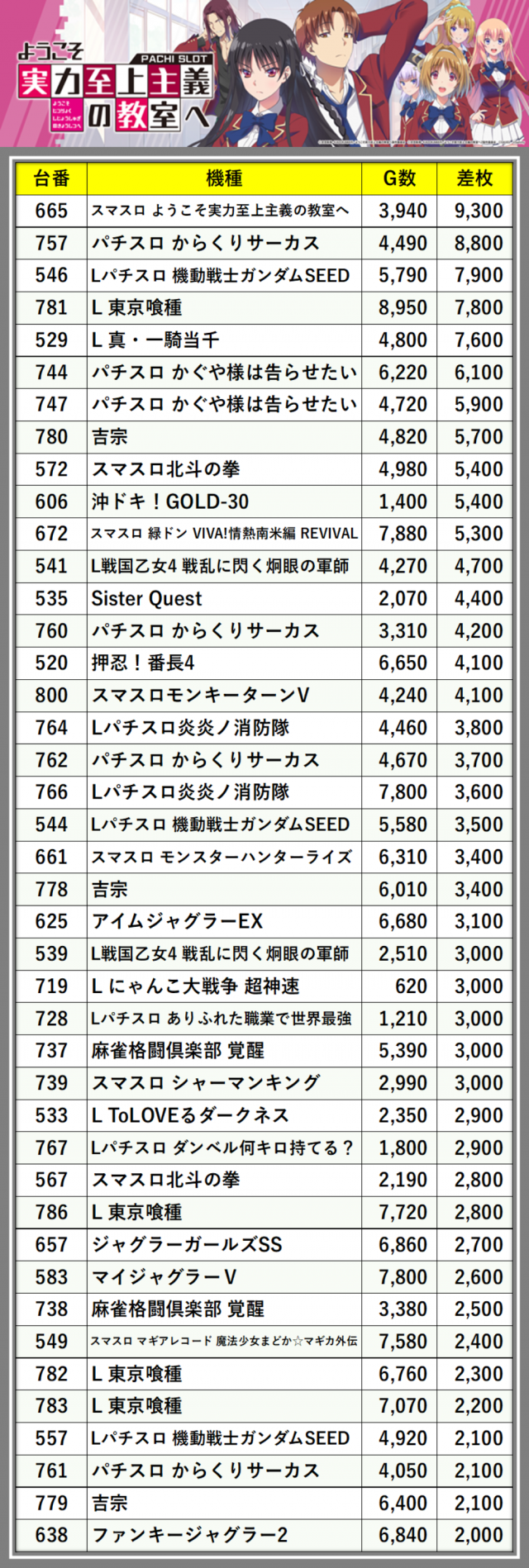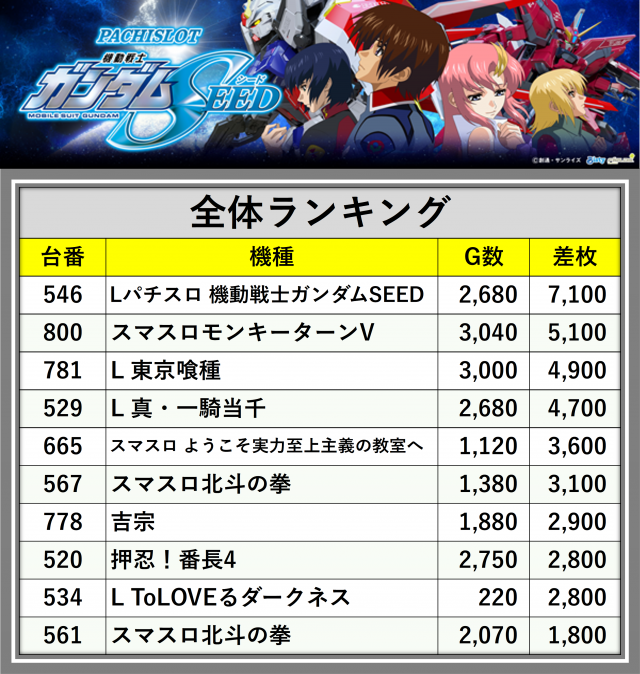 ※差枚数順に掲載しています