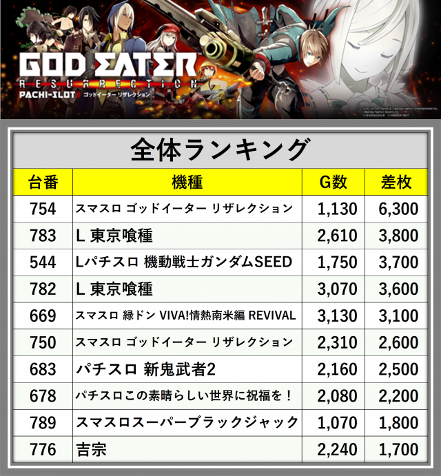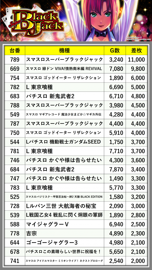※差枚数順に掲載しています