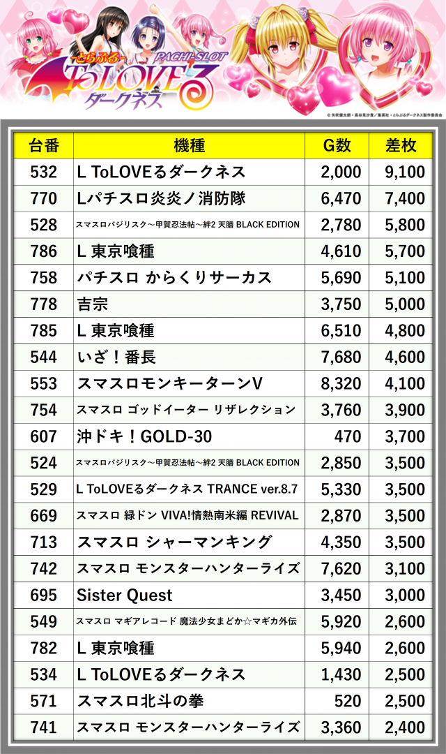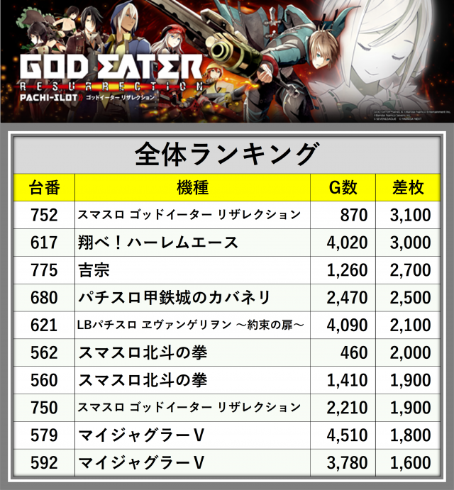 厳選された取材対象機種をはじめ、その他スロット全体から好記録が飛び出した!プレイヤーが楽しんだ1日を下記データにて振り返ってみて欲しい。