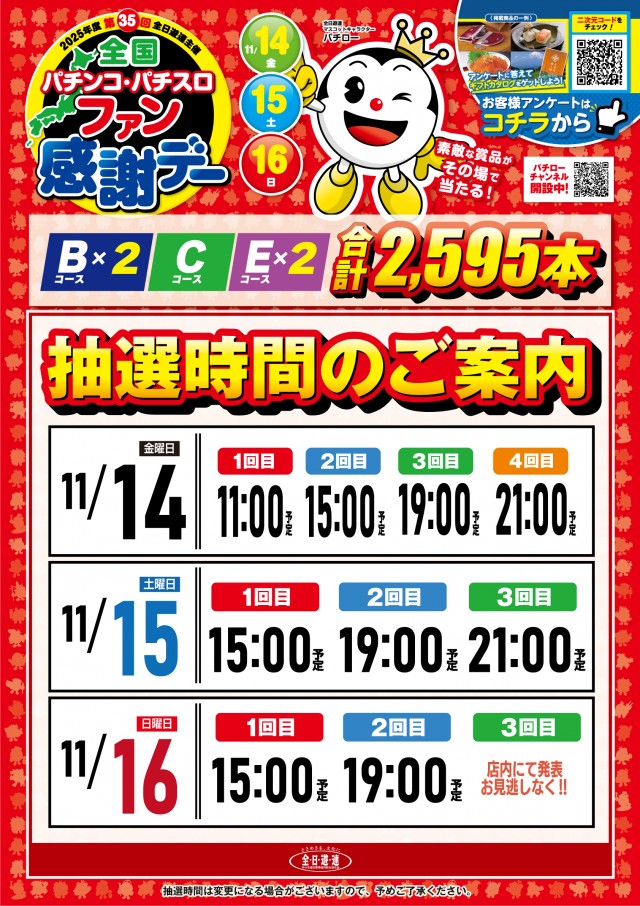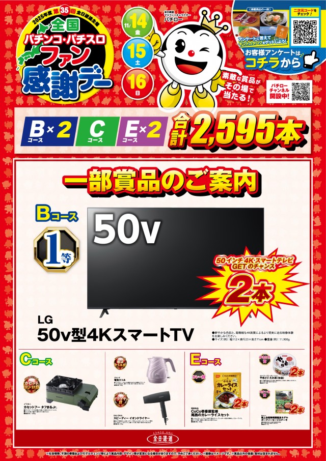 本日全国パチンコ・パチスロファン感謝デー♪豪華景品多数‼