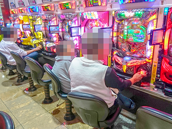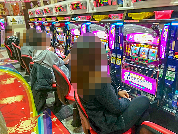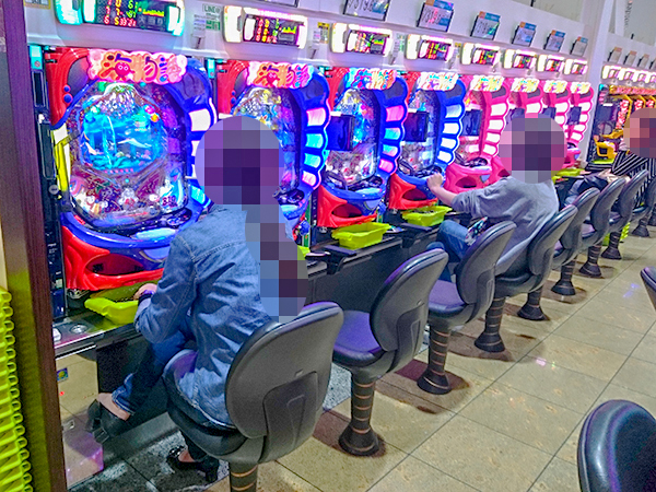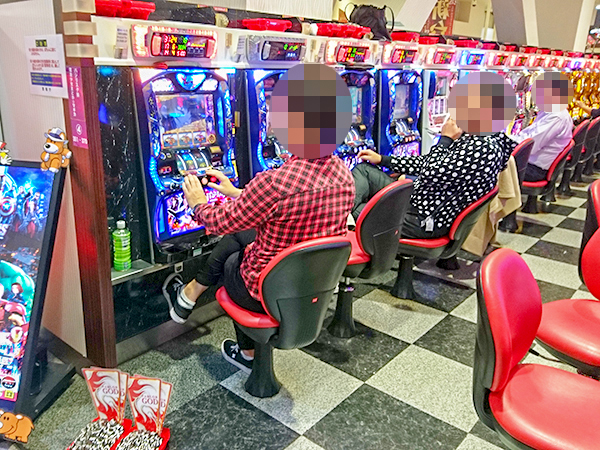 取材時の店内には多くのプレイヤーが来店。パチンコ・パチスロ共に、様々な機種が支持を集めていた。